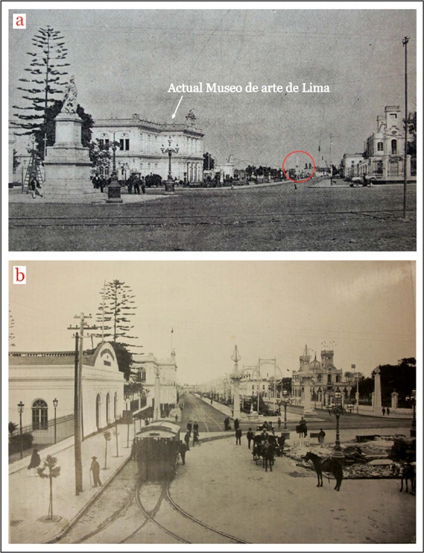 Dichas vías estaban intercomunicadas por óvalos en donde se habían levantado monumentos como el del Combate del dos de mayo, en 1874, y el de Bolognesi y los caídos en la batalla de Arica, en 1905, a sus veras se habían construido edificios y espacios públicos como el Palacio y Parque de la Exposición, de 1872, el Hospital Dos de Mayo, de 1875, la estación del Tranvía Lima-Chorrillos, de 1903, y desde inicios del XX se habían levantado cerca de la avenida 9 de Diciembre viviendas de la oligarquía nacional. En la plazuela de la Exposición, que intercomunicaba las avenidas 9 de Diciembre y Grau, al frente de la estación del Tranvía Lima-Chorrillos y al Palacio de la Exposición, se erigió en 1906 el monumento donado por Pérez Roca (MONTEVERDE, 2019b) (Figura 12).