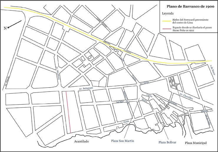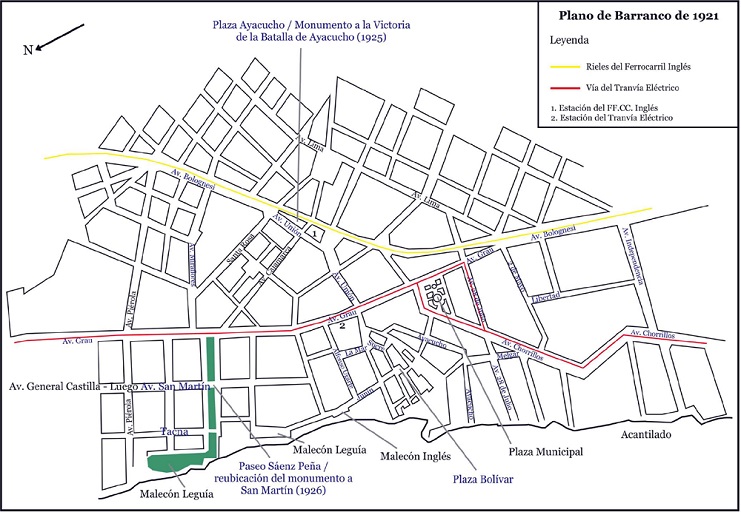 Desde mediados del XIX, Barranco, ubicado a varios kilómetros al sur de la antigua Lima, quedó intercomunicado a esta a través del ferrocarril Lima-Chorrillos. A principios del XX se inició la construcción del tranvía eléctrico Lima-Chorrillos.25 Al igual que en Lima y El Callao desde inicios del XX, muchos de los nombres de las calles principales de Barranco estaban asociados a los héroes del Pacífico (Grau, Alfonso Ugarte y Bolognesi) y a las batallas libradas contra el ejército chileno en Lima (Chorrillos y Mirafores).26 A ellos, se suma la existencia de las plazas Bolívar y San Martín27 (Figura 15).
