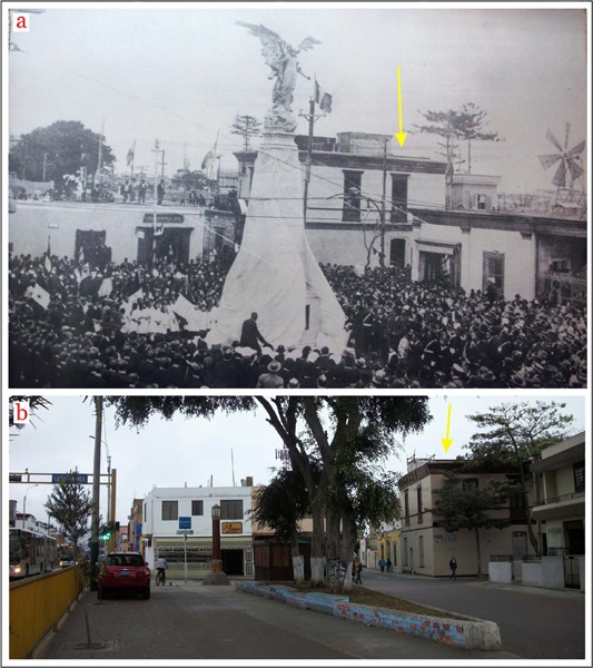 Primero se pensó colocarlo en la plaza Mayor de Lima, para que estuviera en uno de los espacios donde se proclamó la Independencia en 1821 (MONUMENTO A SAN…, 1906c). Luego se propuso la berma central de la avenida 9 de Diciembre, donde había un pequeño obelisco en mal estado. Esta opción se descartó porque la altura del monumento del prócer interrumpiría la perspectiva del monumento a Bolognesi y los caídos en la batalla de Arica, localizado a poca distancia (Figura 13a). Por ello, el alcalde Federico Elguera propuso que el monumento a Cristóbal Colón fuera sacado de la plazuela de la Exposición para emplazarlo donde estaba el pequeño obelisco, y que en dicha plazuela se colocara el de San Martín, donde fue erigido en la segunda mitad de 1906 durante el gobierno de José Pardo (1904-1908) (COLOCACIÓN DEL MONUMENTO…, 1906) (Figura 13b).