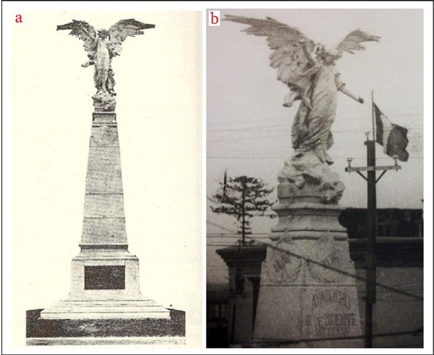 En mayo de 1924, De las Casas, alcalde de Barranco, recomendó que el monumento a San Martín: “… debía terminar en punta monolítica sin colocar el ‘Ángel de la Misericordia’ [alegoría a la Victoria] por estar así en armonía a la índole del objeto y puede servir el Ángel para otro monumento, colocándolo sobre una base especial” (BARRANCO, 1924a, p. 291). Se refería a uno dedicado a la Victoria de la batalla de Ayacucho, proyectado a ser develado para el centenario del evento.30 En agosto de este año, el alcalde expresó que el representante de la familia Pérez Roca (Pérez Espinoza) estaba de acuerdo con alterar el monumento pues: “antes semejaba más un monumento al Ángel de la Misericordia que a San Martín, dado que la estatua del […] prócer […] parecía un accesorio del referido monumento que hoy es la fgura principal de él” (BARRANCO, 1924b, p. 298-299).