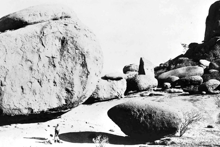 Gostaria, contudo, de focar por alguns instantes na figura 4. O arquivo não traz nenhuma outra informação sobre essa fotografia, a não ser que ela foi tirada em território da África do Sudoeste Alemã. No entanto, ela contém alguns elementos que chamam a atenção para pensar o modo de apropriação do espaço pelas lentes fotográficas do colonizador alemão. Vemos nessa imagem rochas enormes em um ambiente aparentemente árido e com parca vegetação. No canto inferior esquerdo, porém, notamos a presença de quatro pessoas brancas (uma família talvez, composta pelo pai e pela mãe, ambos em pé, uma moça que está sentada e ao seu lado um jovem rapaz, também sentado no chão). As suas presenças nesse registro fotográfico denunciam, acima de tudo, a dimensão das rochas (tal como recorrente na pintura romântica alemã do século XVIII): seus corpos servem de referência para o observador dessa fotografia do tamanho real das rochas encontradas nesse ambiente. Esta fotografia foi posteriormente utilizada como um cartão postal que anuncia que o local se chama Erongo (próximo a Swakopmund) e que essa localidade era um lugar turístico para os colonos que ali viviam e aos possíveis visitantes da colônia.