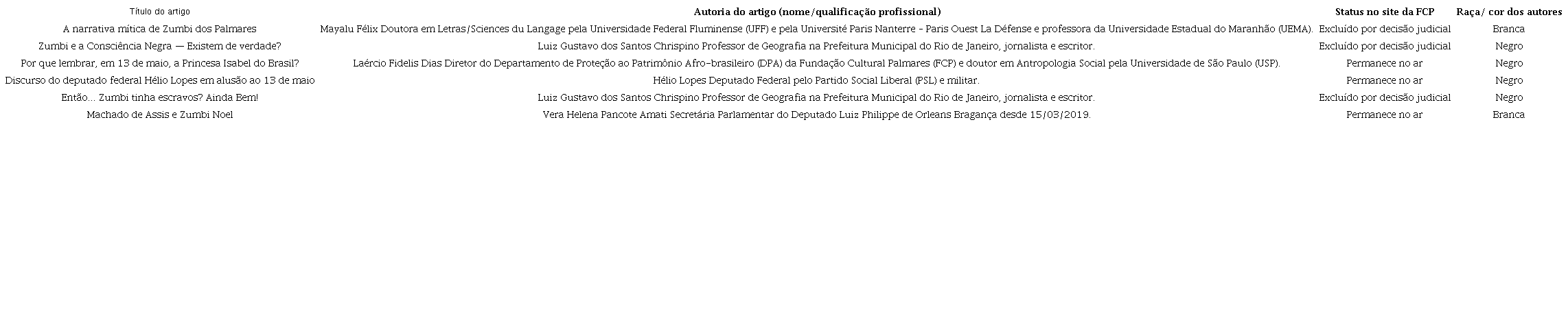 Tais publicações geraram um intenso debate. Para além da discussão midiática, ações populares foram movidas na Justiça, o que resultou na ordem judicial de retirada de três artigos do ar. Nós preservamos os textos antes de eles serem excluídos do sítio oficial da FCP, bem como consideramos o conteúdo dos processos judiciais para a construção deste artigo. Vale acrescentar, contudo, que dois dos textos excluídos por decisão judicial do site da FCP foram posteriormente publicados em sites de movimentos de extrema-direita, onde permanecem acessíveis ao público sem quaisquer alterações. Um deles, de Mayalu Félix, não se encontra mais disponível na web4. Por meio da Tabela 1, descrevemos melhor o escopo desse segundo corpus documental:
