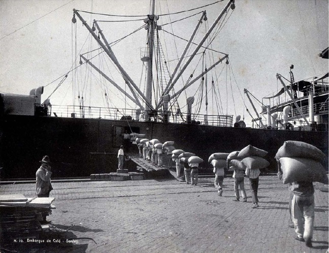 As sacas de café, ao chegarem a Santos, eram descarregadas dos vagões dos trens e colocadas nos depósitos; alinhados ao longo da via férrea, carroças e carretões estacionavam junto a esses locais e retiravam a mercadoria, iniciando o transporte para os armazéns e/ou para o porto. Apesar da existência de firmas organizadas, os carroceiros, na sua maioria imigrantes, dividiam entre si esta função. Estas atividades dependiam da safra, quando seu ritmo era intensificado e o número de carroças transitando crescia em proporção direta ao aumento da quantidade de café exportado. Pelas ruas estreitas, sob um calor sufocante, os carroceiros corriam ao lado dos veículos puxados a burro; nos armazéns eram feitas a viragem, as misturas e o reensaque do café para exportação. No porto, o embarque se realizava carregando-se os sacos de café; como num formigueiro, humanos trabalhadores subiam e desciam com sacos nos ombros as pranchas do cais para o convés dos navios, ou de um navio para outro.