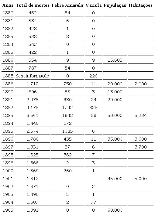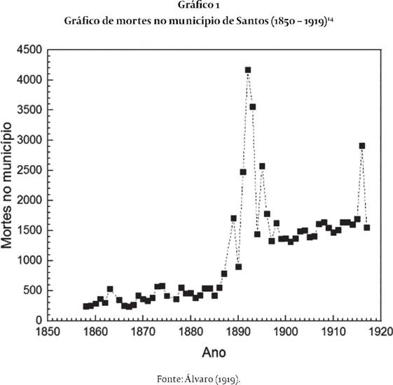 O médico sanitarista Guilherme Álvaro da Silva, no seu compêndio memorial e histórico das epidemias (período de 1872-1905), registrou o crescimento de moradores de Santos de pouco mais de 9 mil pessoas (1872) para cerca de 60 mil habitantes (1905), destacando um decréscimo da população em 1890 devido às epidemias (cólera, febre amarela, varíola). Pela obra se observa que eram várias as moléstias que vitimavam a população santista e que geravam assustadoras taxas de mortalidade (tuberculose, tétano, cólera, coqueluche, impaludismo)10. No período de 1889-1905 faleceram 30.173 pessoas, dessas 6.789 atingidas pela febre amarela, que junto com a varíola e a febre bubônica foram as epidemias que provocaram maior morbidade.11