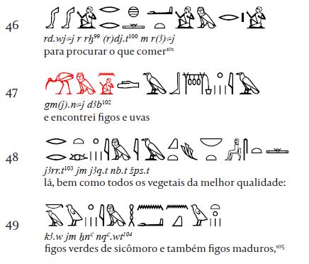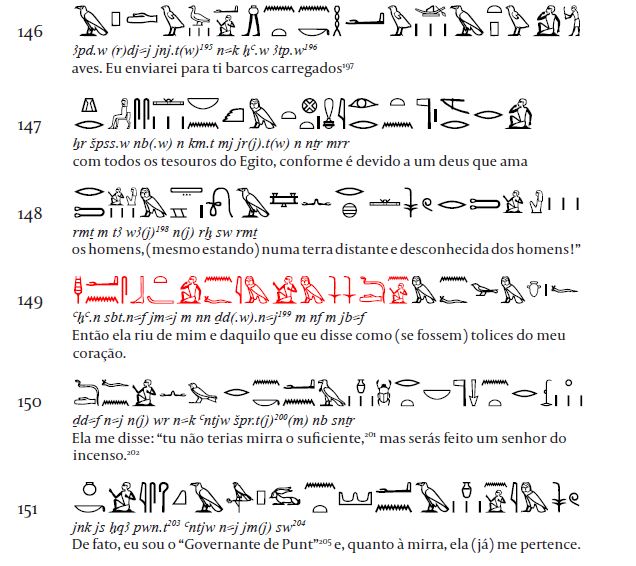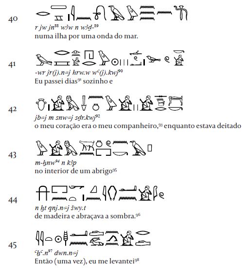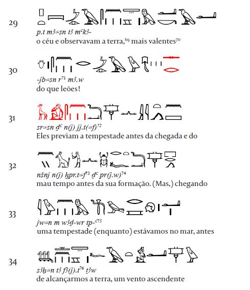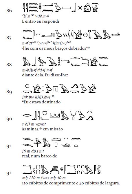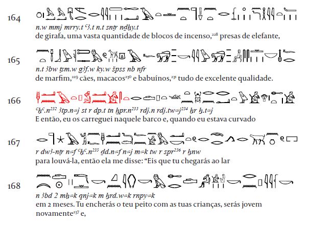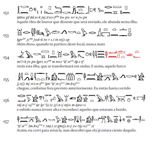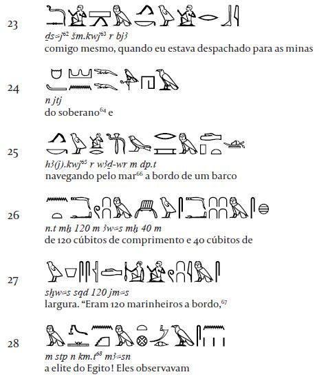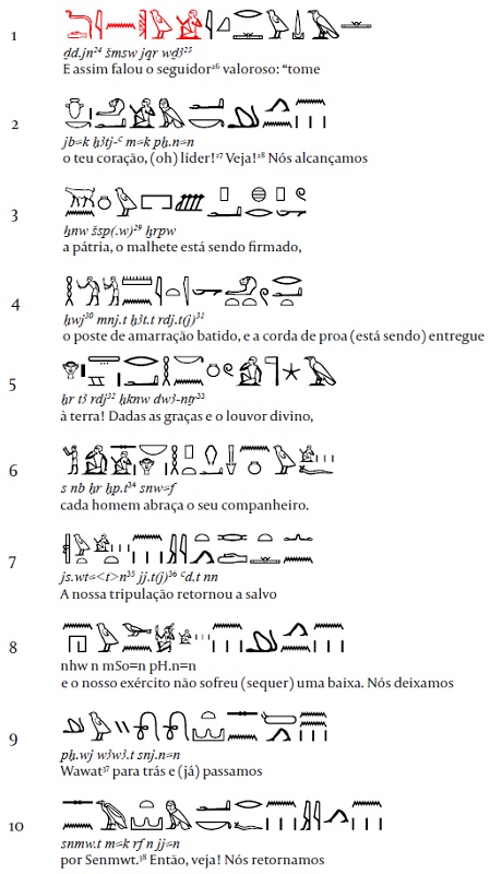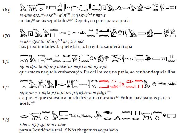 246 Lit.: “rio abaixo”. Cardoso (1998, p. 128) manteve o termo literalmente (“navegou corrente abaixo”). Araújo (2000, p. 79), Brancaglion (2006, p. 172) e Canhão (2012, p. 19) traduzem a expressão como “norte”. Graças a características geográficas do Egito, na língua egípcia, diz-se “rio acima” (ḫntj) e “rio abaixo” (ḫdj) quando se faz referência a deslocamentos no sentido Sul e Norte, respectivamente. Uma interpretação literal aqui é inviável, já que o barco está em mar aberto. Compare com os exemplos comentados na linha 85.