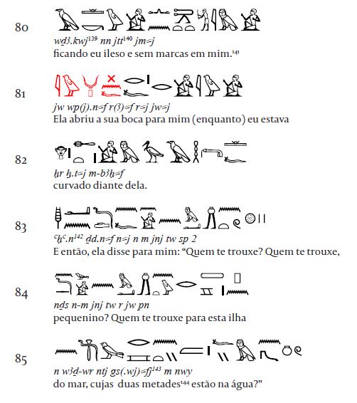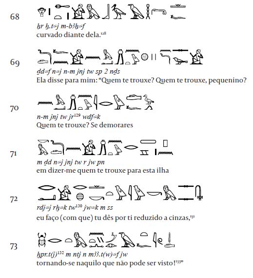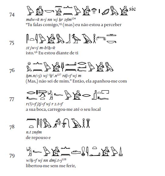 Em Portugal, o conto foi publicado pela primeira vez em 1901 (ESTEVES PEREIRA, 1901, p. 5-23), embora se trate apenas de uma tradução a partir da versão francesa produzida por Maspero (1882).7 Uma tradução portuguesa do original egípcio só foi produzida em 2010 numa tese de doutorado (CANHÃO, 2010a; 2010b). O autor republicou o mesmo texto numa obra autônoma em 2012 (CANHÃO, 2012) e reaproveitou o texto numa antologia em 2014 (CANHÃO, 2014). Todavia, essa versão apresenta incoerências na relação entre a transliteração e a tradução.8