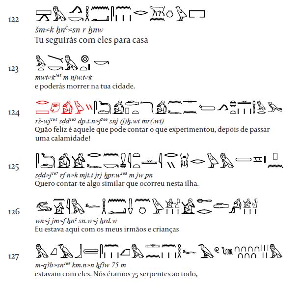 245 Le Guilloux (1996, p. 65, n. 83) acredita que a tripulação saudou o náufrago, não a serpente. Ele argumenta que não houve interações entre os marinheiros e a serpente. Possivelmente, a tripulação desembarcou e conheceu a serpente, uma vez que o náufrago dificilmente embarcaria todos os presentes sozinho. O conto não tem a pretensão de preencher todos os detalhes sobre a viagem.