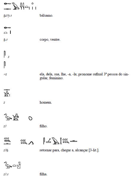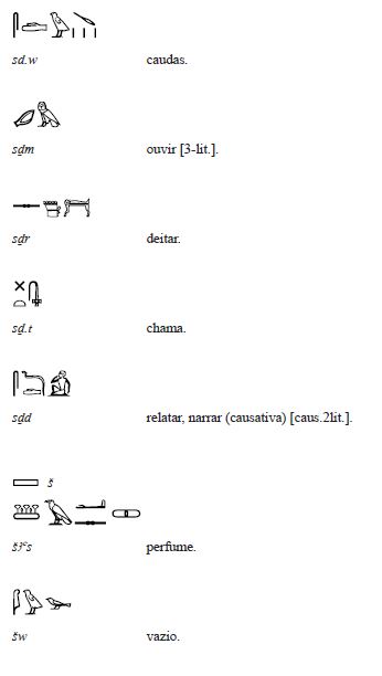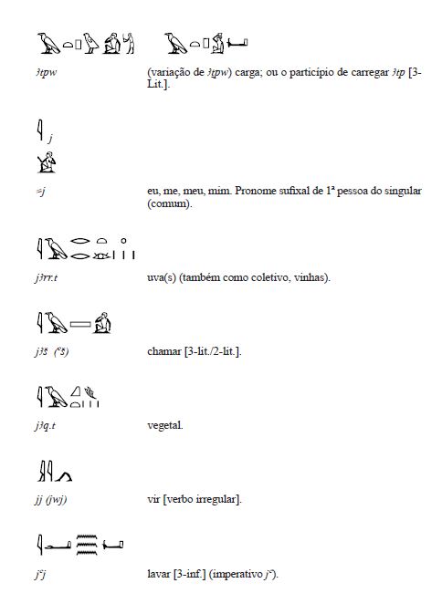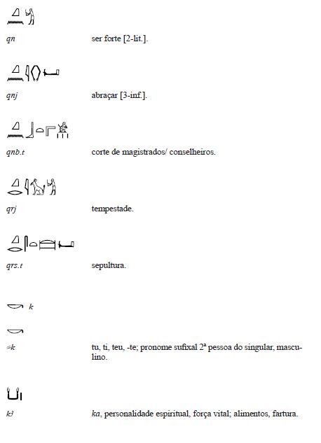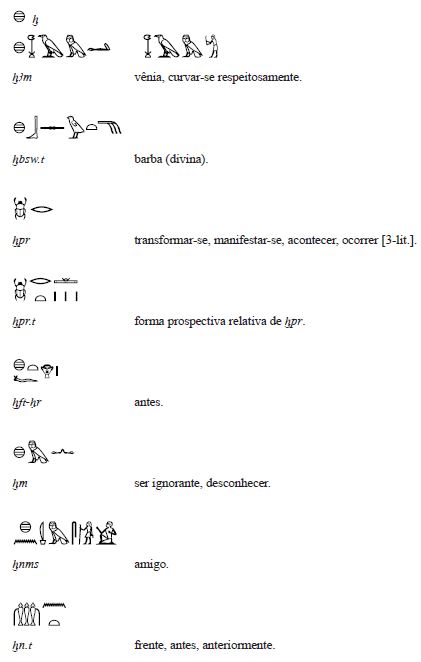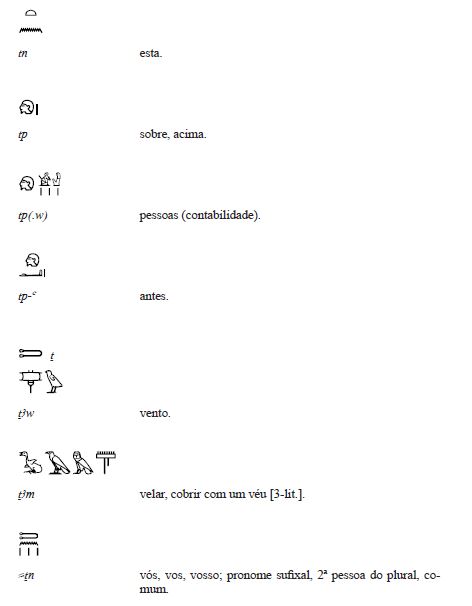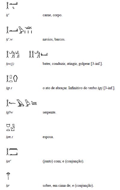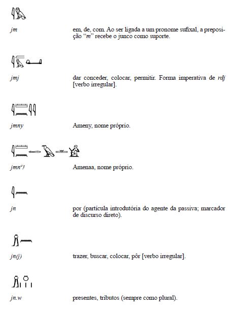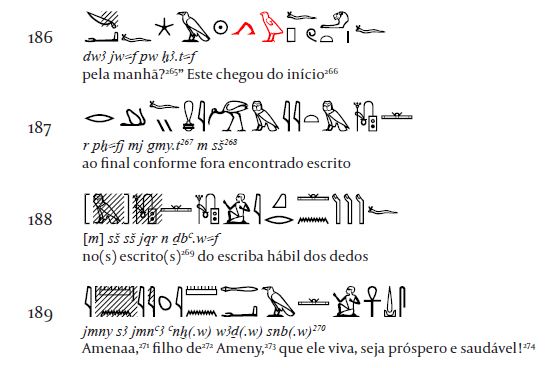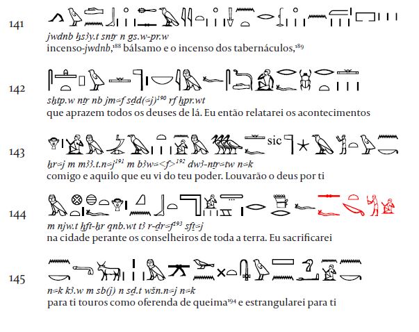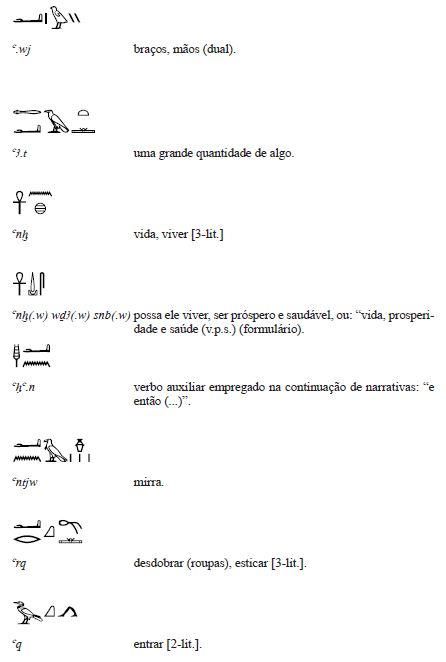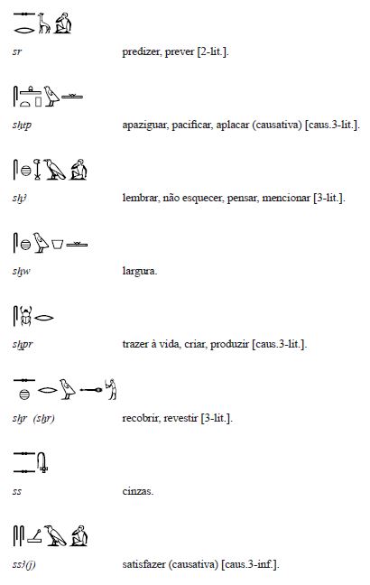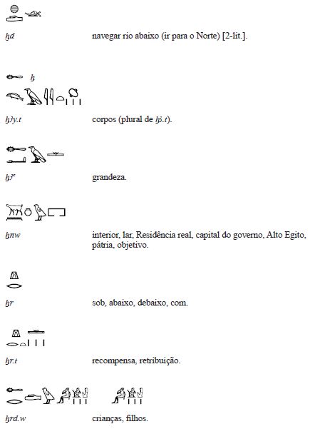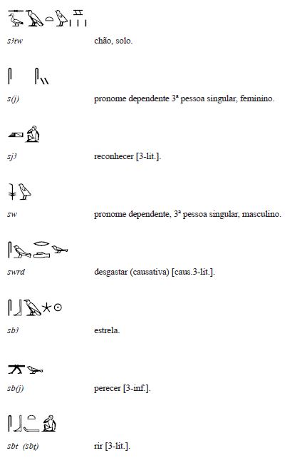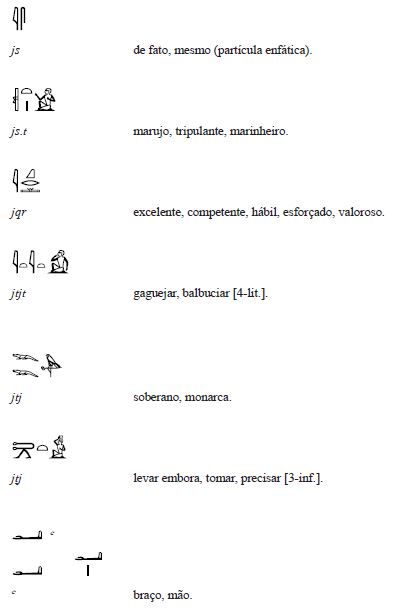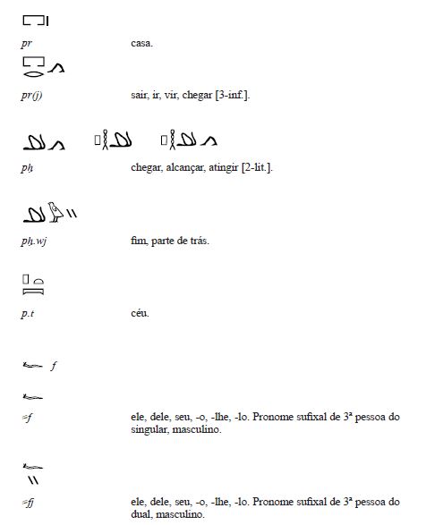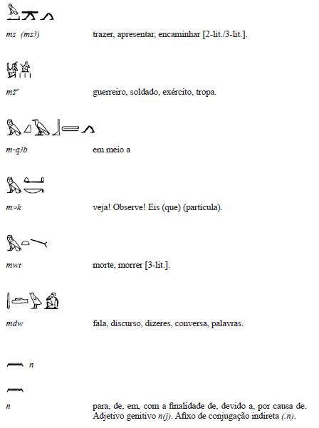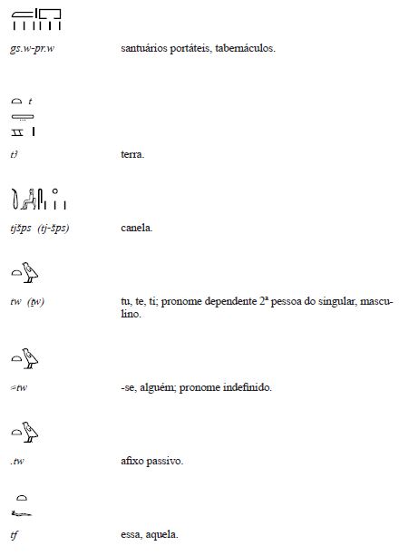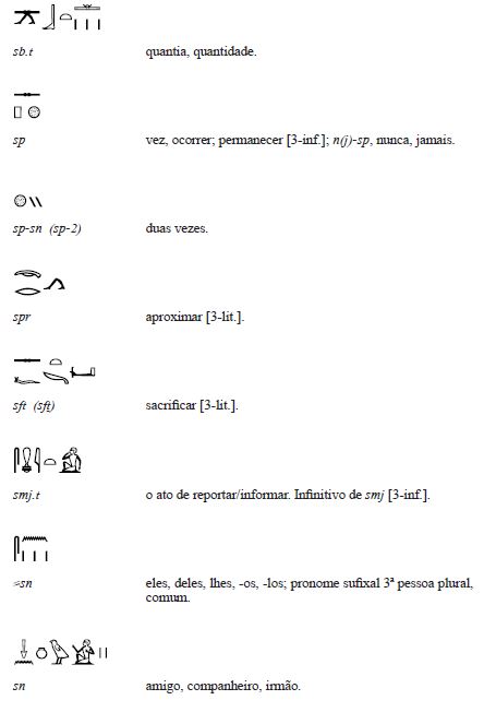 A gramática, a terminologia e as convenções de transliteração das palavras aqui adotadas seguem Pereira (2016 [2014]).11 O dicionário adotado foi o de Hannig (2006), com ocasionais consultas comparativas aos dicionários de Bonnamy e Sadek (2010 [2009]), Faulkner (1991 [1962]), e ao Thesaurus Linguae Aegyptiae (TLA).