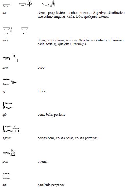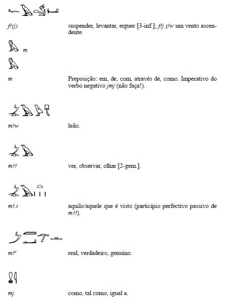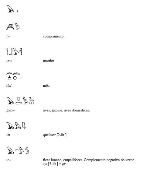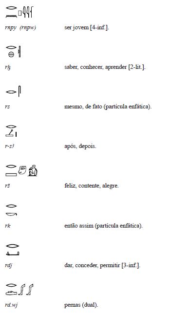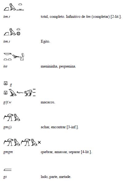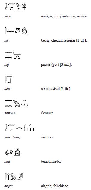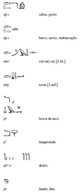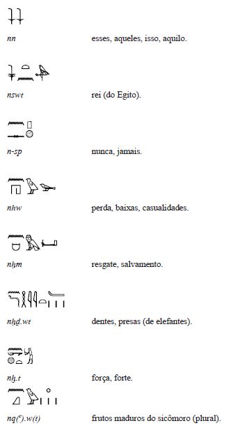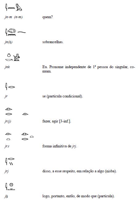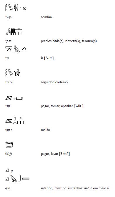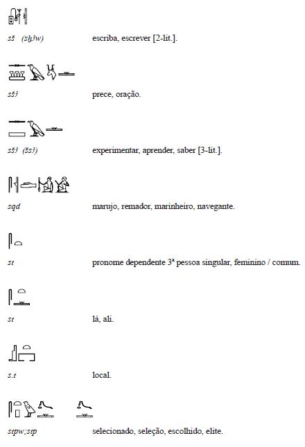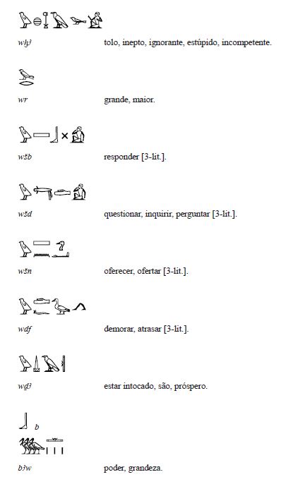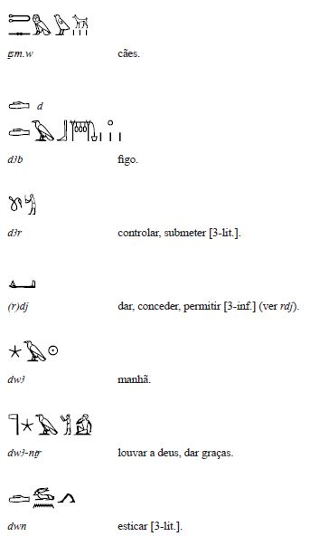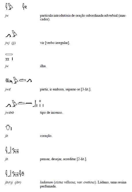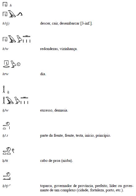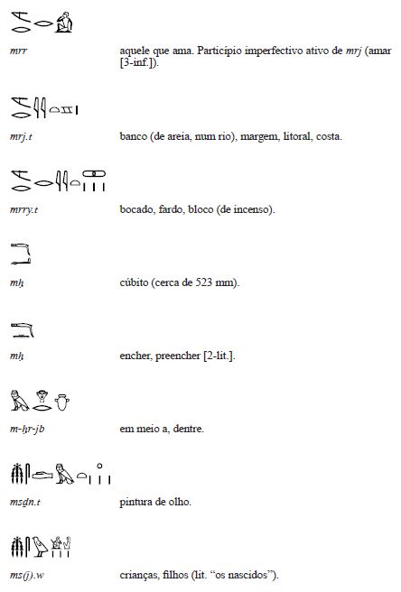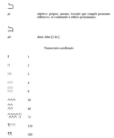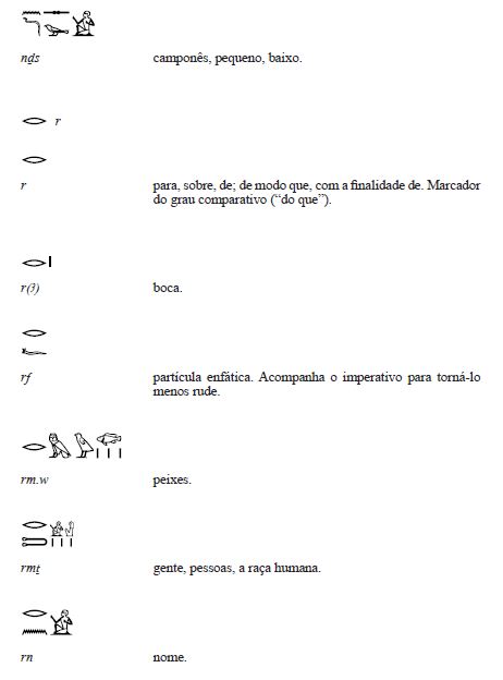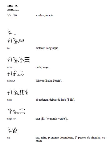 A gramática, a terminologia e as convenções de transliteração das palavras aqui adotadas seguem Pereira (2016 [2014]).11 O dicionário adotado foi o de Hannig (2006), com ocasionais consultas comparativas aos dicionários de Bonnamy e Sadek (2010 [2009]), Faulkner (1991 [1962]), e ao Thesaurus Linguae Aegyptiae (TLA).