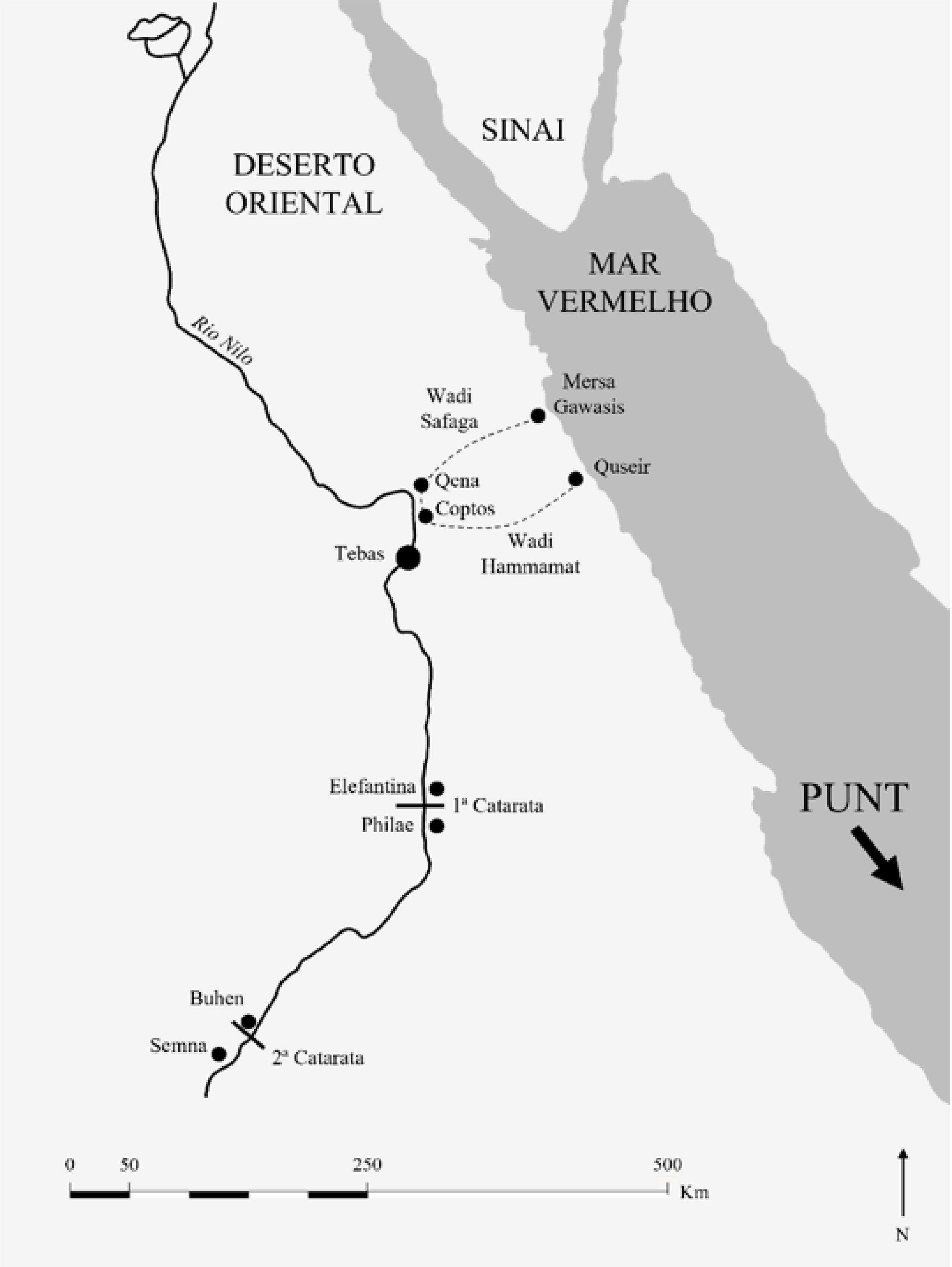 A conexão terrestre com o Mar Vermelho integrava as navegações na região mineira do Sinai e portos de escala mais próximos da capital (TALLET, 2015, p. 31-72). Desses portos, Mersa Gawasis tornou-se particularmente relevante para o comércio com o Punt (OBSOMER, 2019, p. 7-66). Os grandes navios para lá destinados eram construídos em secções em Coptos (gbtjw) e Qena (