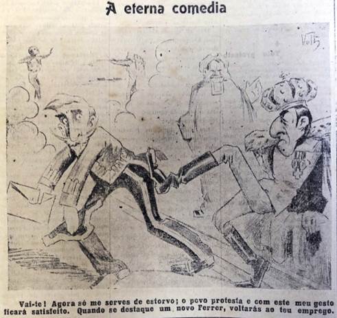 No mais, importa ressaltar que tanto o título como a legenda adicionados pelos redatores do periódico à ilustração reiteram essas representações. “A eterna comédia” é um jogo de palavras que satiriza a situação: a tragédia da morte de Ferrer, fruto de uma decisão autoritária do rei, sob o controle do Clero - joga com o imaginário da relação entre eterno e divino e atribui a decisão pela morte de Ferrer a uma atitude inquisitorial da Igreja. Já a legenda, disposta de maneira a soar como uma frase do rei a seu subordinado, reforça que a demissão de Maura não passava de uma estratégia da monarquia católica da Espanha para atenuar a pressão da população sobre o governo após os acontecimentos da Semana Trágica.