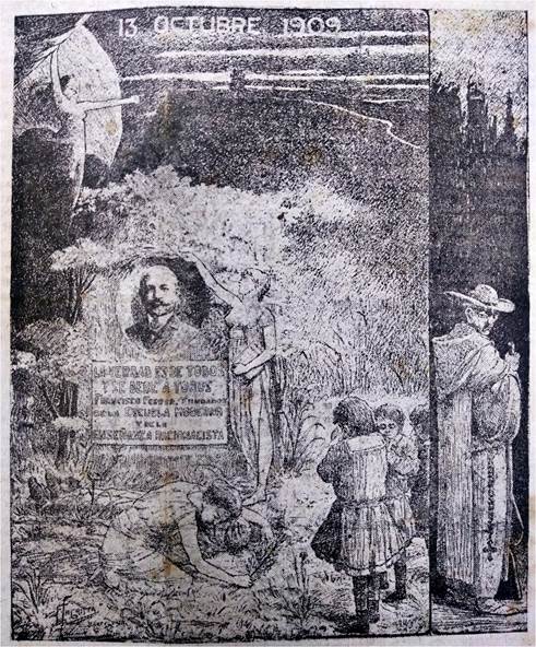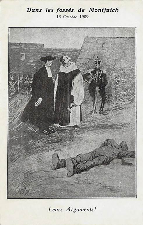 No mais, vale ressaltar que as Figuras 8 e 10 são de autoria do mesmo artista: Firmín Sagristà. O pintor espanhol foi também um convicto militante anarquista, colaborou com o jornal de Ferrer na Espanha, La Huelga General, e com o magoniano Regeneración durante a Revolução Mexicana. As ilustrações de Sagristà foram produzidas ainda no ano de 1909 e também circularam em formato de postal, suporte pelo qual possivelmente chegaram à redação de A Lanterna. Nas duas ilustrações do espanhol é possível identificar um elemento que não está presente na Figura 9 - na margem de cada uma delas está um clérigo que observa de forma sorrateira a cena. A presença do elemento clerical nas ilustrações de Sagristà é de extrema importância na medida em que insere a homenagem a Ferrer como pauta anticlerical.