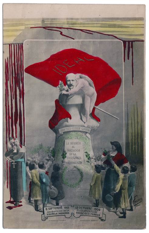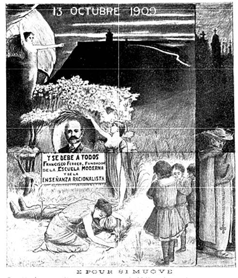 O ilustrador trabalha com o jogo de luz e sombra para passar a mensagem da luz contra as trevas, da denúncia do complô jesuítico e da identificação e responsabilização dos inimigos da luta pela educação racionalista. Reconhecido no meio libertário, o artista chegou a passar um período em cárcere devido a estas e outras ilustrações em homenagem a Ferrer, o que pode inclusive ter impulsionado a difusão das mesmas. Ambas foram localizadas em diferentes veículos da imprensa internacional.