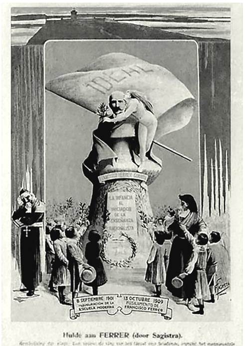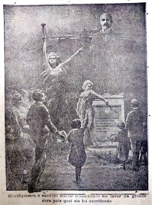 Guardadas suas particularidades, nas três ilustrações estão fortemente presentes elementos do imaginário do mito político do herói-salvador caracterizado por Girardet. Em todas elas Francisco Ferrer y Guardia tem para si uma espécie de monumento por meio do qual é admirado ou adorado por um grupo de pessoas. Ademais, há ainda outros elementos em comum entre elas, como a presença das mulheres e das crianças, símbolo da infância - para quem se direcionava seu trabalho -, além das musas - alegorias da Liberdade ou mesmo da República, a fim de enfatizar os ideais laicos sob os quais se erige o ídolo. Uma particularidade interessante na Figura 9, utilizada mais de uma vez pelo periódico paulistano e que pode ter sido produzida por um de seus colaboradores, é a presença de homens adultos. Ali, pela primeira vez, Ferrer está diretamente relacionado ao elemento operário nas iconografias veiculadas sobre ele em A Lanterna. Essa ligação da figura do educador à pauta dos trabalhadores aparenta servir essencialmente à bandeira anarquista do periódico.