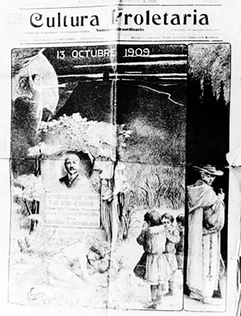 Assim, essa semelhança entre as obras permitiu categorizá-las em uma série de representações imagéticas da denúncia, por meio do caso Ferrer, do complô clérico-estatal que deveria ser combatido. Na condição de mito político, Ferrer y Guardia parece ser utilizado aqui na chave de explicação do real - o que se denuncia através desta iconografia é o poder e a influência da Igreja nos negócios de Estado, a opressão estatal, em consonância com o Clero, sobre os discordantes e combatentes e, sobretudo, o uso do aparato militar dos estados nacionais em prol da repressão dos divergentes e das classes menos abastadas, situação que a classe operária paulistana sentia na pele, com prisões e expulsões compulsórias de militantes11.