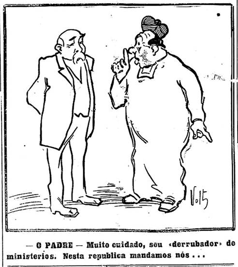 O primeiro destaque é para outra ilustração de Voltolino (Figura 16), então veiculada na capa da edição de número 52, de 8 de outubro de 1910. Mais simples e com bem menos elementos que as demais, a ilustração retrata a interlocução entre dois personagens: Francisco Ferrer, que aparece caricaturado, e um membro do Clero. Este, que é representado com um corpo avultado, faz um gesto para que o professor fique em silêncio. O catalão, por sua vez, está formalmente vestido e aparentemente sereno, mantém as mãos para trás, o peito aberto e os olhos fixos nos do clérigo - cuja expressão parece agitada, fosse por raiva ou medo. A postura firme de Ferrer diante do religioso passa uma mensagem de não resignação diante do avanço clerical. Na legenda, os redatores de A Lanterna reforçam o mito da conspiração no que seria a fala do padre ao professor: “Muito cuidado, seu ‘derrubador’ de ministérios. Nesta república mandamos nós…”.