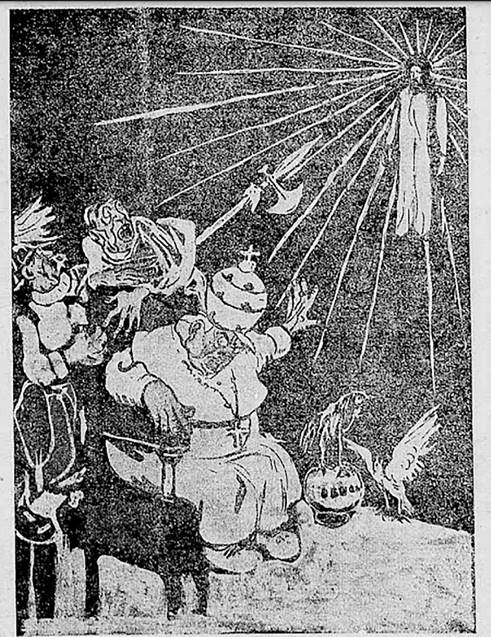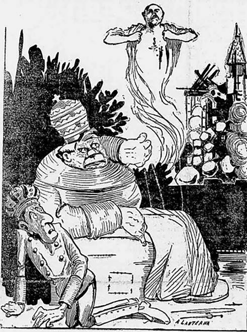 Segue essa lógica a Figura 17, publicada no segundo número do periódico. De autor desconhecido, identifica-se ao pé da ilustração uma inscrição com o nome do jornal, de forma que é plausível inferir que a obra seja de algum colaborador ou tenha sido produzida sob encomenda para A Lanterna. Ocupando a capa da edição, a movimentação de elementos cristãos para atacar o clericalismo é bastante evidente na imagem. Na figura, o rei aparece de joelhos, assustado e se escondendo aos pés do papa (novamente obeso) que, sentado e furioso, assiste à Ferrer “subindo aos céus”, que remete a um espírito ou um fantasma. O educador mostra com expressão de dor, mas com certo orgulho, o peito perfurado pelas balas do fuzilamento, evocando assim uma imagem quase santificada de sua morte, como o Cristo martirizado que expõe as chagas de sua crucificação - no que pode ser lido como uma espécie de “transferência de sacralidade”, na qual a linguagem e os símbolos da religião se fundem em um molde secular (DI STEFANO, 2008, p.172).