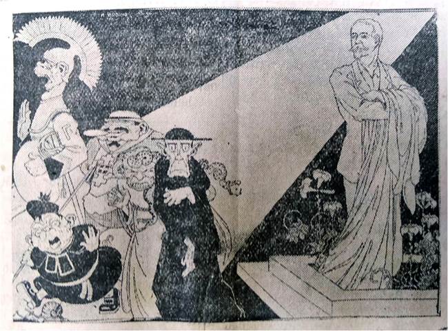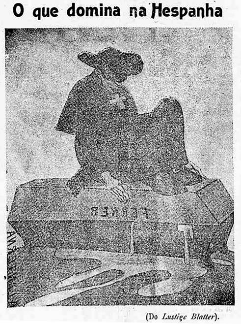 A decisão do governo espanhol pelo fuzilamento de Ferrer y Guardia teve repercussão negativa em todo o Ocidente, gerando inclusive uma crise política no país europeu, que enfrentou uma onda de protestos após a execução do educador. No Brasil, A Lanterna comemorava já em sua segunda edição, em matéria de capa, a deposição do então primeiro-ministro espanhol, Antônio Maura, descrito no jornal como “jesuíta” e “bandido carola, principal mandatário do covarde assassinato de Ferrer”7. Chama-se atenção para a definição que fizeram de Maura porque, mesmo não se tratando de um membro do Clero, os redatores do jornal evocaram o elemento religioso para atacá-lo, denominando-o de “jesuíta” e “carola”, para explicitar sua ligação e apoio aos membros da Igreja. Nota-se que a mesma estratégia fora utilizada pelo jornal ao se referir, ainda no primeiro número, ao rei Afonso XIII, descrito na ocasião como um espantalho do clero. Assim, a representação dos dois maiores nomes do Estado espanhol têm sua imagem relacionada à Igreja quando atacados, o “espantalho do clero” e o “carola”, ou seja, apesar não serem totalmente eximidos de suas responsabilidades políticas na morte de Ferrer, a grande responsável, que estaria por trás das ações dos estadistas, seria a Igreja.