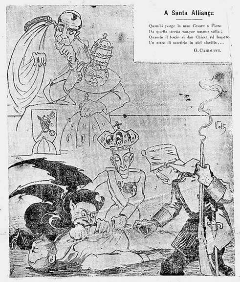 Atrás da cena principal é possível identificar a figura de um bispo que, pelo gesto que faz com a mão direita, parece abençoar a atitude do rei. Estratégia utilizada de maneira recorrente por anticlericais, a ilustração evoca símbolos relacionados à religião católica para fazer uma crítica ao Clero, jogando com as ideias de incoerência e hipocrisia. Neste sentido, observa-se a tese de Di Stefano acerca de uma dissidência anticatólica essencialmente religiosa no mundo ibero-americano, na medida em que tanto a lógica que guia essa crítica, como o capital simbólico em jogo são religiosos (DI STEFANO, 2008). A gravura traz alguns elementos como a “trindade opressora” (POLETTO, 2011) - no caso Clero, Estado e polícia - e a figura clerical obesa, representação dos pecados da gula e avareza, no intuito de gerar a sensação de fartura do Clero em contraste com a penúria dos trabalhadores em meio ao contexto de carestia da vida. Na relação Igreja-Estado em um regime monárquico, a imagem reforça ainda uma hierarquia na qual estaria no comando o papa e não o rei, apesar de este aparecer em primeiro plano. Seguindo a lógica do legendário simbólico da conspiração, o clérigo aparece ali estrategicamente fora dos holofotes, sorrateiro, manipulador, controlador, verdadeiro responsável pela situação.