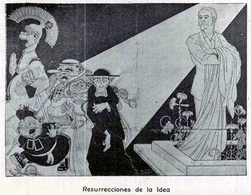 Nesse mesmo sentido de representação do educador a Figura 19, apesar de também denunciar o complô monárquico-jesuítico ou clérico-estatal, passa como principal mensagem a força do mito Ferrer na condição de Guia ou Salvador. Em A Lanterna a ilustração foi publicada na capa de 12 de outubro de 1912, em homenagem a Ferrer e, no ano anterior, fez parte do projeto editorial da edição 19-20 - comemorativa do 13 de outubro daquele ano - da já citada revista costa-riquenha Renovación, onde recebeu o título de “Ressurreições da Ideia” (Figura 20). De autoria não identificada, acredita-se não se tratar de uma ilustração brasileira, sendo possível, inclusive, que a versão do jornal anticlerical tenha sido retirada da revista racionalista12.