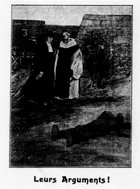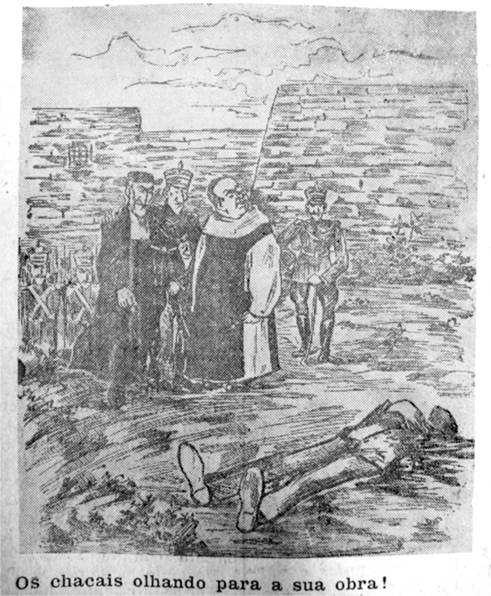 Na mesma linha de iconografias que mantém o foco na denúncia do complô clerical no caso Ferrer, podem ser citadas outras duas ilustrações brasileiras publicadas nas páginas de A Lanterna. A primeira delas foi veiculada na capa da edição de número 4, ainda no ano de 1909, e também é de autoria de Voltolino. Em uma representação gráfica que mistura caricatura e desenho livre, o artista reproduz a cena do que parecem ser os instantes seguintes ao fuzilamento de Ferrer y Guardia. Na ilustração, quatro dos seis personagens não são meramente fictícios, e, exceto por Ferrer, estes aparecem caricaturados: o rei Afonso XIII na cena principal e, ao fundo, o papa Pio X e, ao que parece, Tomás Costa y Fornaguera, o arcebispo de Tarragora - arcebispado ao qual respondia o bispado de Barcelona. Já os outros dois personagens, criados livremente pelo cartunista, representam as próprias instituições Igreja, na figura do clérigo, e Estado/aparato policial, na figura do soldado.
