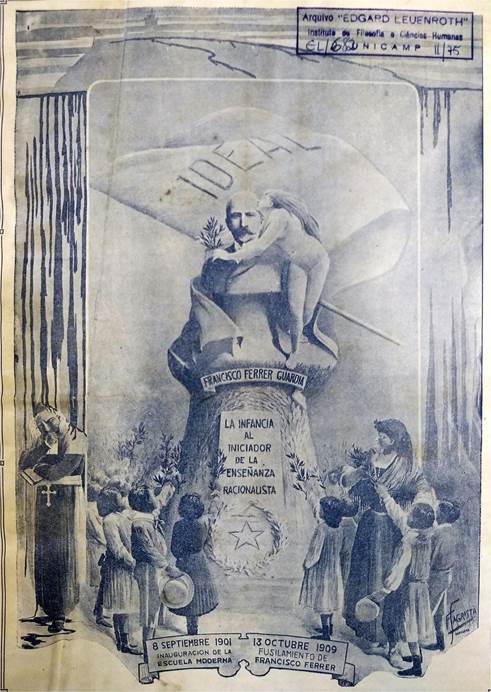 Nota-se, finalmente, que na série formada pelas três ilustrações analisadas o conjunto de representações iconográficas reforça a ideia de Ferrer como mártir da educação popular. É essencialmente a partir desta categoria de representação que se constrói, no periódico anticlerical, a figura do educador como mito salvador, guia da revolução social. Assim, na condição de mito político, Ferrer y Guardia parece ser utilizado, sob esta ótica, como mobilizador da luta travada pelo periódico em prol da educação popular e do operariado.