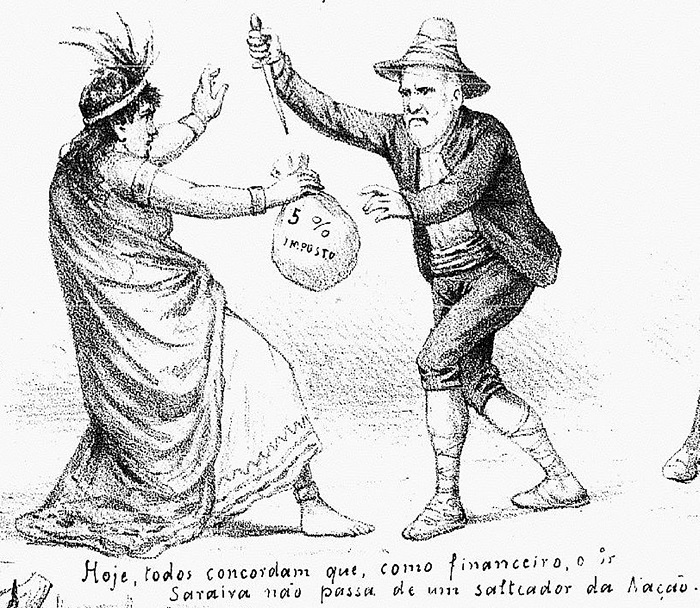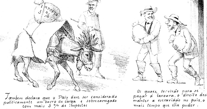 Em meados de julho daquele ano de 1885, atento aos desdobramentos políticos do governo, Angelo Agostini criticou a proposta do imposto por meio de suas caricaturas. Na primeira delas (Figura 1) é possível ver um burro em primeiro plano, animal de carga, utilizando um cocar indígena, alegoria com a qual Agostini costumava representar o Brasil (BALABAN, 2009, p. 287). Sobre o lombo sobrecarregado, o asno leva, exausto, o peso do imposto dos 5%, acompanhado atentamente por Saraiva, de relho na mão. Ao lado dessa representação, o ilustrador desenhou dois fazendeiros felizes, com sacos de dinheiro nos braços, produto do imposto que recaía sobre o lombo do país e com o qual seriam quitadas as alforrias dos seus escravizados. Desse modo, Agostini criticava a criação da taxa que não recairia sobre os gêneros de exportação como o café, mas que beneficiaria os cafeicultores, vistosos senhores de cativos do Império. O imposto resultaria numa espécie de transferência social de renda para os mais ricos por meio do Estado, taxando de forma desigual os brasileiros e favorecendo a ampliação das desigualdades sociais através dessa política fiscal com vistas a privilegiar os mais poderosos. No mês seguinte, em agosto, Agostini voltou a criticar a proposta, representando Saraiva assaltando o país com o referido imposto, como um criminoso (Figura 2).