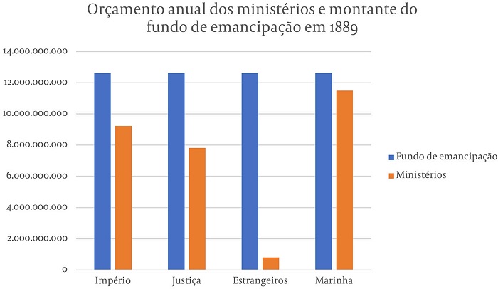 Poucas semanas depois de instituída a República, no último dia de 1889, parte dos jornais do Rio de Janeiro divulgou amplamente o relatório feito por Ruy Barbosa, ministro da Fazenda do Governo Provisório, no qual descrevia a “situação financeira legada à República pela monarquia”.68 O documento apresentado ao Marechal Deodoro da Fonseca ainda no dia do golpe republicano, no dia 15 de novembro, acusava a Coroa de “acumular elementos de ruína”. Por isso, o novo ministro da Fazenda pretendia demonstrar ao país que “a República não encontrou senão dificuldades, compromissos, urgências imperiosas”. Entre as cifras listadas, estava o vultoso “saldo do fundo de emancipação”, que correspondia a 12.622:308$776 (doze mil, seiscentos e vinte e dois contos, trezentos e oito mil e setecentos e setenta e seis réis). Esse valor era maior do que o orçamento para os ministérios do Império (9.226:528$097), da Justiça (7.816:574$808), dos Estrangeiros (805.706$666) e da Marinha (11.495:004$305) para todo o ano de 1889, como pode-se observar melhor através do Gráfico 1, a seguir (BRASIL, 1889, p. 7, 9-10.).69 O Governo Provisório teria de lidar com as reclamações cada vez mais constantes contra a cobrança da taxa adicional.