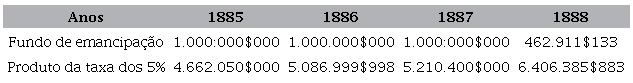 Interessante observar na Tabela 1 que, enquanto as rendas tradicionalmente encaminhadas ao fundo de emancipação sofreram uma queda brusca no ano de 1888, por conta da abolição, o produto da taxa dos 5% apresentou uma alta 18,7% em relação ao ano anterior, demonstrando não só um crescimento do seu montante, mas a persistência de sua cobrança para além do 13 de maio.