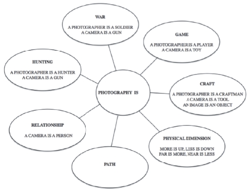Now, based on the analysis of metaphoric expressions, a rich set of correspondences between the source domains and the target domains of photography is identified. Different source domains are used to conceptualize photography: WAR, HUNTING, GAME, PHYSICAL DIMENSION, PATH, CRAFT, or RELATIONSHIP, as depicted further in Figure 3.