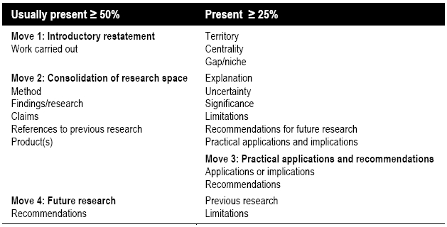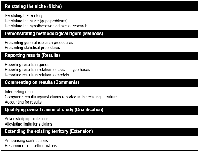 Using yang and Allison’s description of moves in the final sections of RAs in applied linguistics as the starting point of their analysis, other researchers developed a model to suit their findings on RAs and masters dissertations. For example, in their study on RAs in information systems as a branch of business and management sciences, Kwan and Chan (2014) noted that some moves were present in both the results and discussion sections although their frequencies of occurrences varied. They established a unified list of move and step categories for both sections (Table 1).