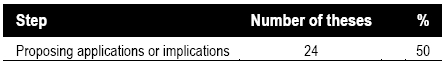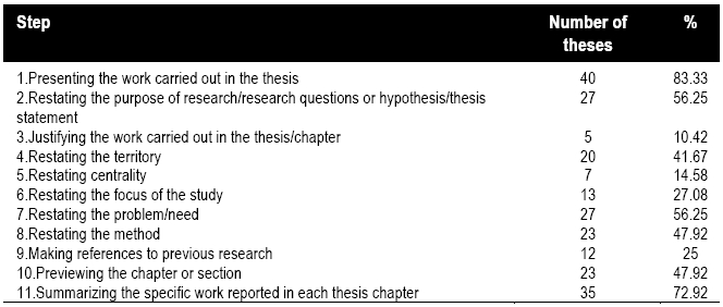 Tables 8, 9, 10, 11 and 12 show the steps found in the corpus and the frequency of the steps in each move. As done with the analysis of moves for the theses with two closing chapters, the move steps in both chapters were included in the counting to obtain the complete picture of each thesis.
