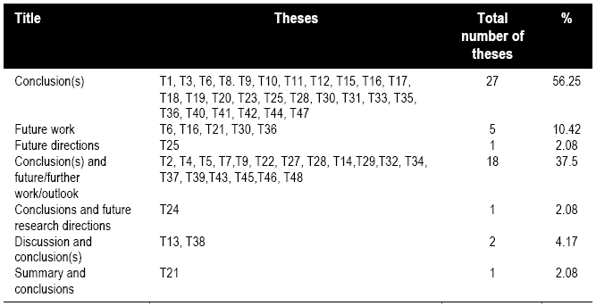 Due to their complex thesis structure, most of the theses have several chapters including concluding sections or subsections with headings such as “Discussion”, “Summary” or “Conclusion” related to a specific topic or case study. Only four theses in the corpus have a separate chapter titled “Discussion” (8.33%). However, all the theses have one or two separate final chapters with other titles. These closing chapters were selected for analysis.
