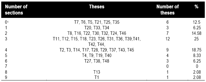 The length of the thesis and the complexity of the research often require divisions of the chapters into sections and subsections in order to organize contents with clarity. At a second stage of the analysis, I examined the divisions and subdivisions of the chapters. The conclusion chapters of 42 theses in the corpus have sections (85.5%) and 19 theses in the corpus have from two to six sub-sections (39.6%). Table 5 shows the number of sections in the conclusion chapters. The data about the six theses with two closing chapters refer to the chapters including the word “conclusion(s)” in their title (the six separate chapters about future work containing from zero to five sections). Most of the chapters are divided into two to four sections (58.33%). The most usual structure is that of three sections (25%).