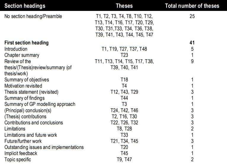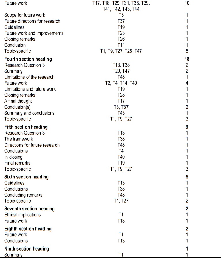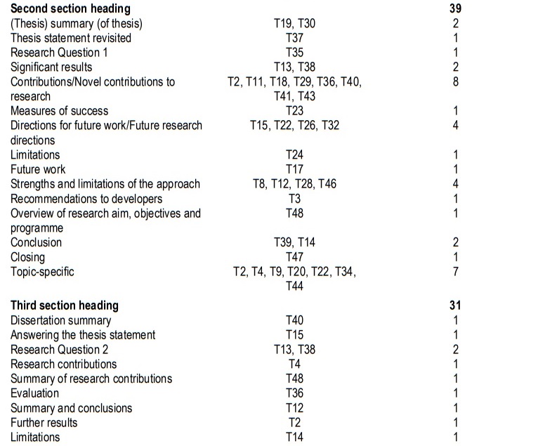 The section headings and subheadings in the conclusion chapters of the theses in the corpus were also examined. I suspected this analysis could provide a macro-level framework of text organization aligned with the choice of linguistic patterning, which is situated at the root of the move-step scheme for the concluding chapters of a thesis. The analysis revealed that the majority of section headings are generic, while most of the subheadings are topic-specific. Topic-specific section headings also predominate in the separate chapters about future work of the theses with two closing chapters.