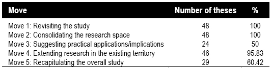 In this section the move structure of the closing chapters in this corpus of computer science PhD theses is presented. Table 7 shows the five-move model for the closing chapters and the number of theses containing each move. For the six theses with two closing chapters, the moves in both chapters were included in the counting in order to obtain the complete picture of each thesis. With reference to this, as also found by Yang and Allison (2003), we must indicate that the moves found in the separate chapters dealing with future work match the corresponding moves in the separate conclusion chapters, which means that these chapters draw on the same moves. Moreover, the moves can be used across chapters in the theses with two final closing chapters, and even sections, in the theses with one unique concluding chapter.