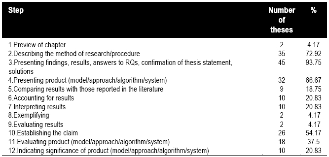 Comparisons with related literature (M2 Step 5) and comments on results are not a priority (M2 Steps 6, 7, 8 and 9), as also found by Posteguillo (1999) in his study of RA discussion/conclusion sections in computer science. Contrary to the findings in Basturkmen (2009) for dissertations in language teaching, the writers of the computer science theses do not usually compare results obtained in the study with results in the literature (Step 5, 18.75%) nor offer explanations for results (Step 6, 20.83%), but highlight their own findings in the closing chapters of their thesis. This could be related to the fact that there is not much previous research work which may be referred to (because the thesis reports novel research or new applications), and also that explanations have been provided at length in the previous chapters of the theses.