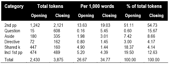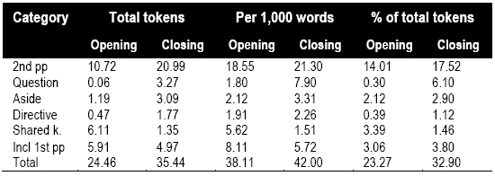 Now that the pragmatic functions of the addressee features in both genres have been discussed, an overall quantitative comparison is in order. In lines with the qualitative results, the addressee features display quite substantial differences in frequency. As Table 1 below shows, the overall frequencies suggest that audience interaction in both genres can be characterized by the predominance of second-person pronouns (>50% of all the features), and this feature shows a slight increase of 3.62% at the closing phase. This in turn reflects the lawyers’ high pragmatic awareness of overtly addressing the jurors. The other features pattern differently in the two genres, however. In the opening statements, shared knowledge and inclusive first-person pronouns, occurring at about the same rate (19.50% and 18.37%, respectively), outnumber asides (7.42%) and directives (3%). Questions are rarely used (0.60%). This is in stark contrast to the closing arguments, where questions (15.67%) and inclusive first-person pronouns (12.63%) appear on top of the list. note, in this concluding phase, a significant increase in the use of questions (of 15%) is witnessed, whereas shared knowledge appeals and inclusive first-person pronouns decline significantly (to 14.24% and 6.87%, respectively). In addition, a slight increase (of about 1.30%) is seen in asides and directives in this phase.