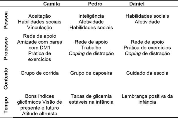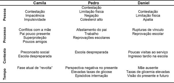 A análise dos dados permitiu identificar características pessoais geradoras, que funcionam como fatores de proteção, e desorganizadoras, que como obstáculos na formação de processos proximais, podem se caracterizar como fatores de risco (Bronfenbrenner & Morris, 1998). Para Camila, as características desorganizadoras estão ligadas à dificuldade de controle dos impulsos e emoções, enquanto que em Daniel e Pedro a apatia e a negação, especialmente em relação à doença, são as características que parecem funcionar como obstáculos para a ocorrência dos processos proximais. Enquanto fatores de proteção, observa-se o engajamento de Camila nas atividades e cuidados necessários para o tratamento da doença, assim como habilidades sociais que favorecem a formação de vínculos afetivos e que também são observadas nos casos de Pedro e Daniel.