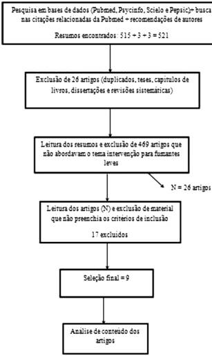A revisão sistemática foi conduzida dentro de quatro bases de dados: PubMed, Psycinfo, SciELO e Pepsic. Como não há consenso na literatura referente à definição do termo, optou-se por utilizar todos os nomes conhecidos, tais como light smoker; non-daily smoker; intermittent smoker; social smoking; occasional smoking e low-level smoking com o operador booleano OR. Além disso, para a pesquisa na PubMed, foram empregados os termos indexados no Medical Subject Heading Terms (Mesh Terms - MeSH) desenvolvido pela U.S. National Library of Medicine que é utilizado como método de controle de vocabulário tanto para resumos presentes na base Medline quanto para os presentes unicamente na PubMed. Os dois grupos de termos foram: intervention study, clinical trial e evaluation studie, e tobacco use cessation e tobacco use disorder com o operador booleano OR. Para essa categoria, optou-se por restringir a busca a apenas aqueles artigos que contemplassem os termos procurados como principal assunto. Por fim, os resultados da busca de cada um dos termos foram cruzados entre si utilizando o operador booleano AND com a finalidade de restringir a pesquisa aos resumos que apresentavam ao mesmo tempo cada um dos termos. Não houve restrição com relação ao ano de publicação dos artigos.