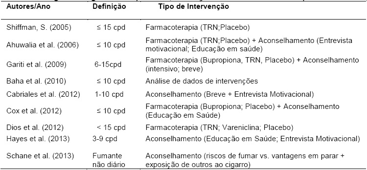 Como constatado na literatura, até o momento da realização da pesquisa não havia uma única definição do termo fumante leve. Percebeu-se que os estudos diferiram com relação à classificação da palavra. Cinco estudos consideraram como fumante leve aquele que fuma menos de dez cigarros por dia (cpd), enquanto dois definiram como menos de 15 cpd. Um artigo classificou fumante leve como aquele que fuma de seis a 15 cpd, e um definiu como quem fuma de três a nove cpd. Observa-se, então, que, de acordo com a literatura, 15 é o número máximo de cpd para ser considerado fumante leve. Além disso, uma pesquisa utilizou fumantes não diários na amostra, o que foi considerado pelos pesquisadores como fumantes intermitentes.