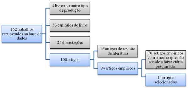 Foram recuperados 162 trabalhos publicados nos últimos 10 anos, dos quais 14 se adequaram aos critérios de inclusão, conforme ilustrado a partir do seguinte fluxograma (Figura 1).