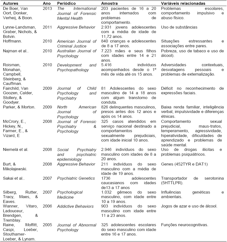 As principais características dos estudos foram sumarizadas em uma tabela (Tabela 1), e os resultados dos estudos revisados foram agrupados em oito categorias construídas a priori considerando as variáveis presentes no modelo Moffitt (1993) e que foram investigadas nos estudos revisados. As categorias são as seguintes: Problemas de aprendizagem; Aspectos neuropsicológicos; Impulsividade e hiperatividade; Comportamentos de risco; Aspectos socioeconômicos; Influências genéticas; Aspectos familiares; e Influência dos pares.
