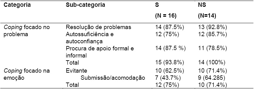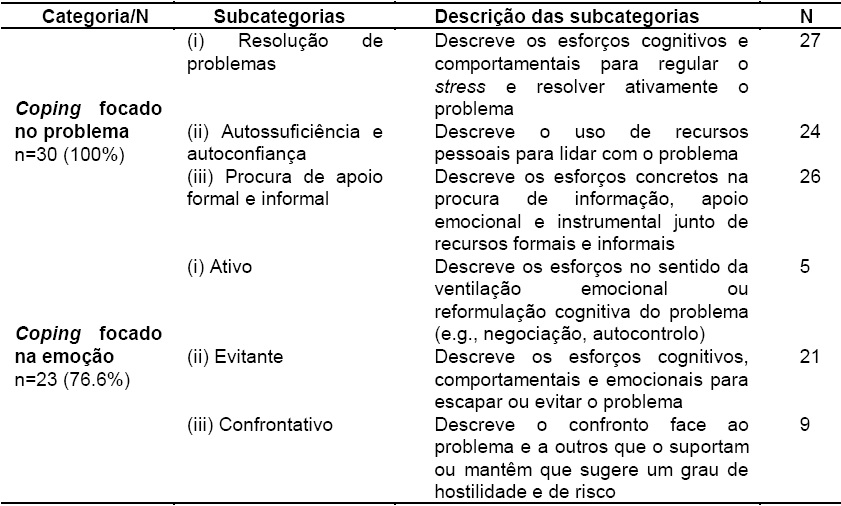 Em uma análise global, e atendendo às áreas, categorias e subcategorias com maior representatividade (mais referenciadas pelas participantes), as mulheres vítimas apontaram para o recurso estratégias de coping em dois domínios centrais (coping focado no problema e coping focado na emoção), como se observa na Tabela 1.