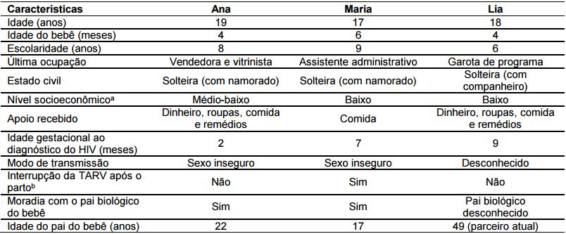Foram entrevistadas três mães adolescentes (17 a 19 anos), que receberam diagnóstico de HIV durante a gestação ou no parto. Todas eram primíparas e seus filhos tinham entre quatro e seis meses de vida no momento do estudo. As jovens se identificaram como solteiras, mas mantinham uma relação amorosa, em dois casos, com o pai biológico do bebê. Nenhuma das participantes estava empregada ou frequentava a escola. A Tabela 1 apresenta os dados sociodemográficos das participantes. A fim de preservar a confidencialidade, foram usados nomes fictícios.