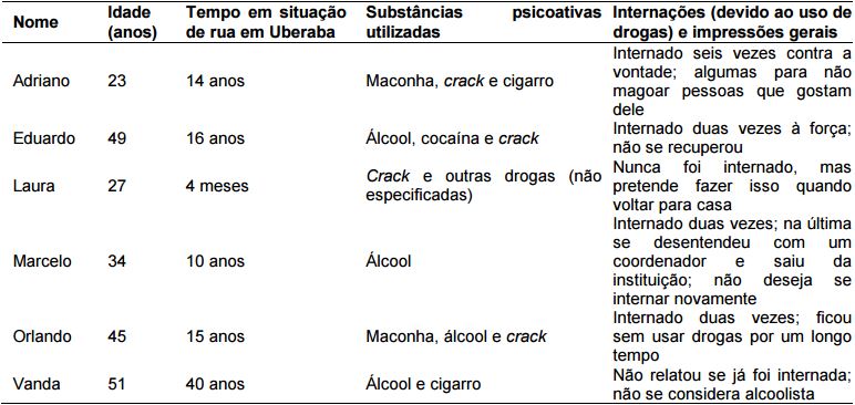 Os entrevistados são quatro homens e duas mulheres, com idade média de 38 anos. Isso se deveu à disponibilidade de acesso aos interlocutores acompanhados pelo CR – ou seja, trata-se de amostra de conveniência. Muitas outras pessoas em situação de rua recusaram responder à entrevista por não desejarem se expor devido à dinâmica da rua que, durante o período de coleta de dados, esteve bastante conturbada devido à morte de um usuário do programa envolvido com o tráfico de drogas.