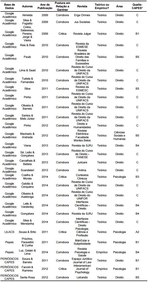 Abstract: After the enactment of Law No. 12,318 in 2010, awareness and discussion of Parental Alienation - AP increased not only in the psycho-legal context, but also social. This phenomenon also reflected in academic publications on the subject. This article analysed the publications on Parental Alienation, in Portuguese, between the years 2008 and 2014 in order to investigate the scientific quality of journals - based on the Qualis CAPES system, and the issues associated with the theme. 816 results were found with the descriptor "parental alienation" with a significant increase after 2010. Based on the inclusion and exclusion criteria, 29 articles followed for further analysis. Of these, 80% were publications of law, only 6.7% were empirical, 86% corroborated with the postulates of AP and ¾ were among the strata B4 and C. The most associated issues were slopes memories and / or sexual abuse allegations (42%) and shared custody (12%). The study concluded that there are many publications on the subject, but there are also publications in Portuguese, a deficit in term structure, methodology and scientific rigor.