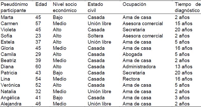 La selección de las participantes se realizó de manera intencional y estuvo determinada por el criterio de saturación. Esto significó que la cantidad de participantes se conformaron gradualmente según la recolección y la interpretación de los datos, y que los investigadores estuvieran en una constante reflexión teórica, conceptual y metodológica durante la investigación. En total, participaron 15 mujeres diagnosticadas con fibromialgia, con edades comprendidas entre los 23 y los 60 años. En la tabla 1 se describen sus características sociodemográficas.