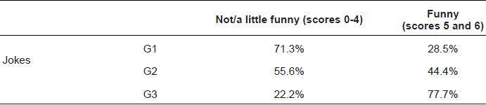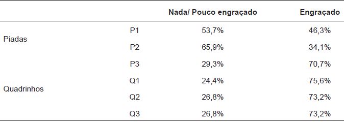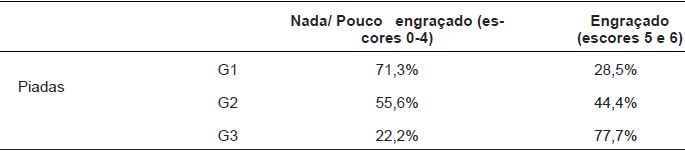 Após a apresentação de cada quadrinho e cada piada, a pesquisadora fazia perguntas para averiguar a compreensão dos mesmos. Em seguida, a pesquisadora apresentava novamente as piadas gravadas, e ao final de cada uma, pedia para que a criança dissesse se a piada era “engraçada” (2 pontos), “mais ou menos engraçada” (1 ponto) ou “nada engraçada/sem graça” (0 pontos). O mesmo procedimento foi utilizado para a avaliação dos quadrinhos. O escore total para apreciação de piadas e de quadrinhos variou, portanto, de 0 a 6 para cada.