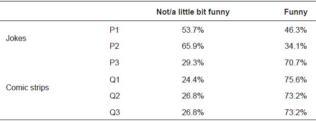 Inicialmente, uma análise de qui-quadrado foi realizada para verificar a distribuição de frequência das respostas fornecidas pelos participantes na avaliação das piadas e quadrinhos (i.e., “Quão engraçada/o é essa piada/esse quadrinho?”. Escores 0 ou 1 classificados como “não/pouco engraçados” e o escore 2 foi categorizado como “engraçado”. Em relação aos quadrinhos, não foi encontrada uma diferença significativa na distribuição de frequência das respostas, χ2 (2) = 0,84, (p = 0,96), ou seja, nenhum quadrinho foi particularmente rejeitado pelos participantes. No entanto, uma diferença significativa foi encontrada na distribuição da frequência das respostas às piadas, χ2 (2) = 11,38, (p = 0,003). Como pode ser observado na Tabela 1, a piada 2 (categoria engano intencional) parece ter sido rejeitada pela maioria dos participantes, sendo que 65,9% dos participantes a consideraram nada ou pouco engraçada.
